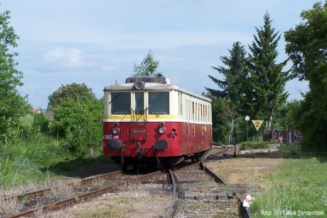 Motorák M 262.018 (830.018) na okraji zastávky a nákladiště v Krumvíři v květnu 2006. Oblíbenou formou zabezpečení vleček a manipulačních kolejí bývaly výkolejky, kombinací zámků propojené s výměnovými zámky. Foto Leoš Tomančák