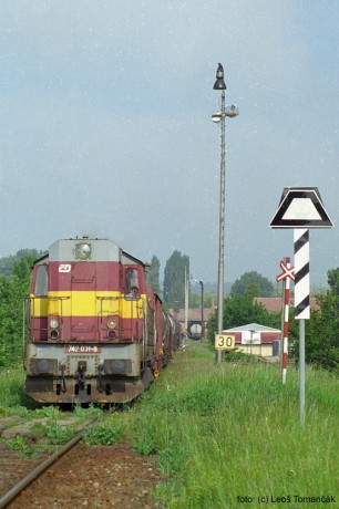 Lichoběžníková tabulka je nepsaným symbolem tratí, provozovaných podle předpisu pro zjednodušenou dopravu (D3). Na konci května 1998 u ní v Kloboukách pózovala lokomotiva 742.031. Foto Leoš Tomančák