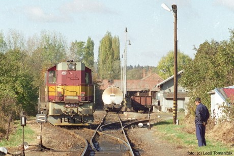 Detailní pohled na vjezdové zhlaví v Kloboukách - ještě klasická návěstní tělesa. Poblíž konců výhybek jsou patrné skříňky, ukrývající výměnové zámky. Jediný prvek zdejšího zabezpečení vlakových cest. Foto Leoš Tomančák