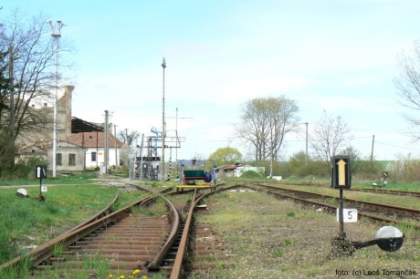 Motorový vůz 810.384 v září 1997 míjí lichoběžníkovou tabulku. Mimo záběr je vlakvedoucí protijedoucího nákladního vlaku, který po přípravě vlakové cesty dával praporkem návěst, dovolující vjezd do zdejší dopravny na dirigované trati. Foto Leoš Tomančák