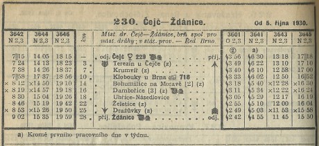Ukázka z úředního vydání jízdního řádu tratě č. 230 Čejč - Ždánice z roku 1930. Na trati byly vedeny smíšené vlaky s parní lokomotivou a nabízely svezení ve 2. nebo 3. vozové třídě.