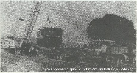 Snímek nevalné kvality, který ale prozradil mnohé - že se vykládka motorových vozů nekonala v Uhřicích, ale na lépe přístupném místě na širé trati o 2 km dál. Repro z výroční publikace 75 železniční trati Čejč - Ždánice