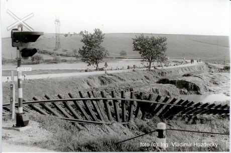 Ze snímku od přejezdu u tehdejší zastávky Věteřov je dobře viditelné původní vedení silnice ke Strážovicím - později bylo přeloženo dál, rovně od přejezdu a teprve pak větším pravotočivým obloukem proti kopci. Foto Martina Řihánková