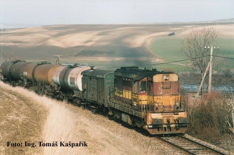 V náročném, avšak fotogenickém úseku od Bohumilic ke Kloboukům stoupá odpoledne 19. 3. 2004 nákladní vlak Mn 82751 s lokomotivou 742.103. Foto Ing. Tomáš Kašpařík