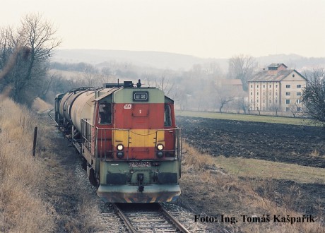 Pohled na čelo nákladního vlaku Mn 82751, který 23. 3. 2005 vyjížděl z Klobouk u Brna, v pozadí buova sila a před ní patrná traťová kolej směr Uhřice a Ždánice. Foto Ing. Tomáš Kašpařík