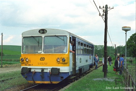 Po poslední období provozu typicky zbarvený motorový vůz 810.290 čeká na výstup na zastávce Želetice, kde bývalo zvykem, že muži vystupují jedněmi a ženy druhými dveřmi. Platilo to i 20. 5. 1998, dva dny před zastavením osobní dopravy. Foto Leoš Tomančák