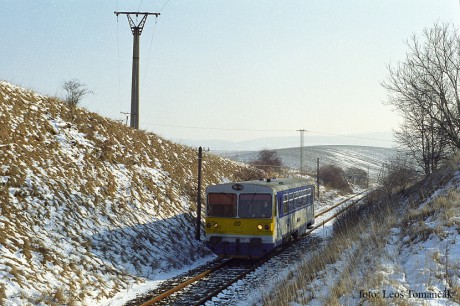 I na jižní Moravě uměl napadnout a chvíli vydržet sníh. Odpoledne 27. 1. 1998 v takové mrazivé a slunečné zimní idyle projížděl zářezem v Kamenci před Ždánicemi vůz 810.153. Foto Leoš Tomančák