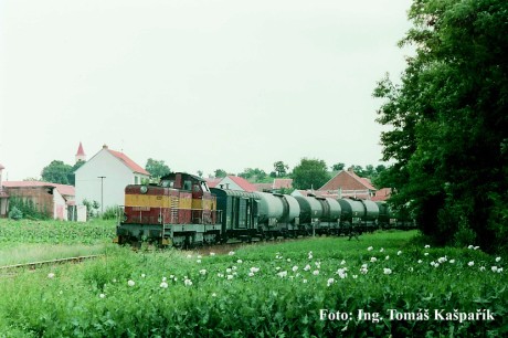 Odpolední manipulační nákladní vlak s lokomotivou 735.064 projždí 18. 7. 1996 okolo Terezína. Foto Ing. Tomáš Kašpařík
