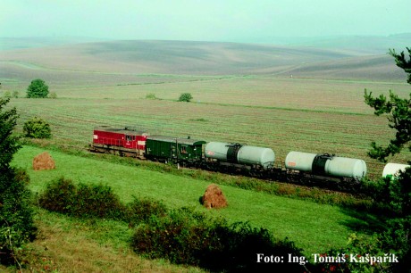 Tzv. předsun zátěže - první várka naplněných cisteren s ropou se 8. 9. 2000 převáží přes kopec z Uhřic do Klobouk a následně se lokomotiva 742.321 vrátí pro další. Foto Ing. Tomáš Kašpařík