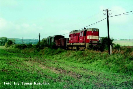 Po převozu předsunuté zátěže za kopec následuje dopolední a již jedná obsluha koncového úseku. Stroj 742.321 tak 8. září 2000 míří k Želeticím, nahoře v pozadí část Násedlovic a kostel sv. Martina. Foto Ing. Tomáš Kašpařík