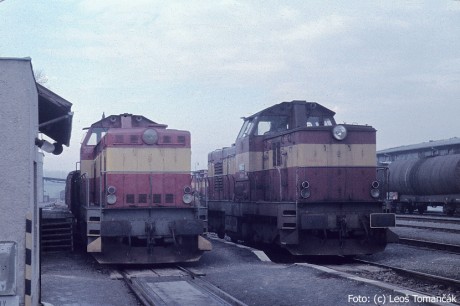 Nejstarší hodonínské lokomotivy řady 735 (T 466.0) - 007 a 008 v žst. Čejč dne 12. 1. 1993. V pozadí patrný stroj 735.138. Foto Leoš Tomančák