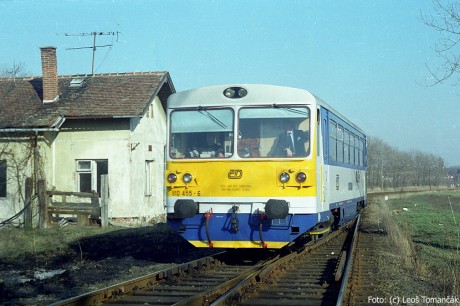 Jeden ze dvou odpoledních párů osobních vlaků z Čejče do Klobouk míjí 11. 3. 1997 už opuštěnou budovu někdejší odbočky u Čejče. Foto Leoš Tomančák